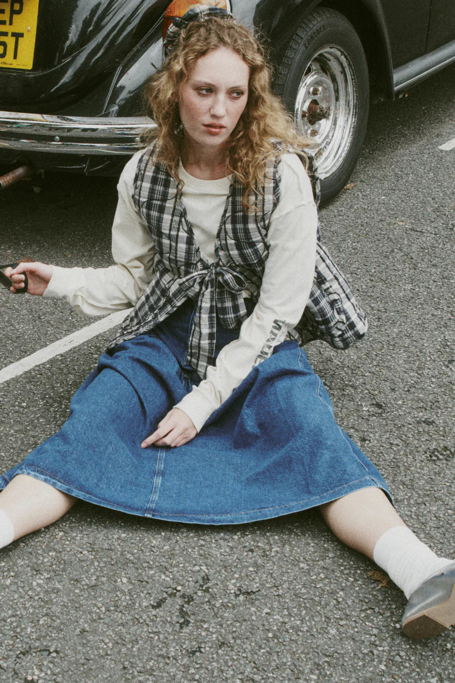 The Arte Gilet is our all over check design cropped gilet featuring a tie front closure. frill pockets and a DM branded embroidery detail.