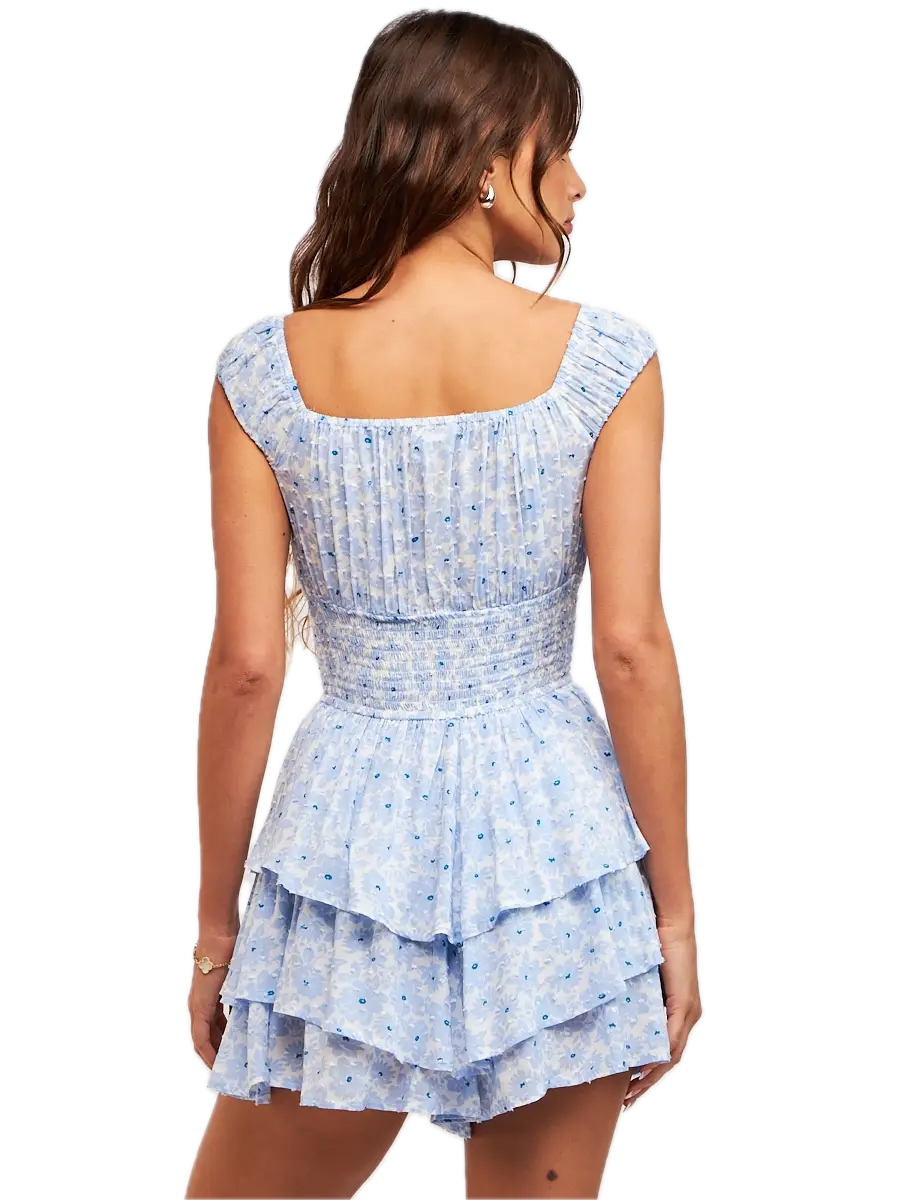 Short sleeve mini romper with smocked bodice and tiered ruffle skirt