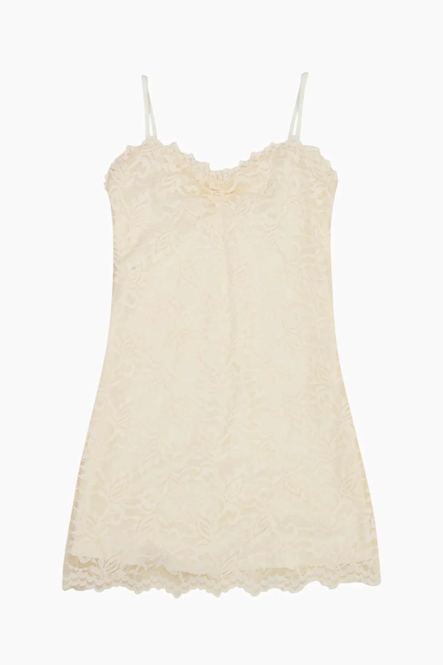 So sweet in the Siofra Dress. This pretty piece stuns with a lace-adorned fabric with scallop details, thin spaghetti straps, and a frayed neckline. The dress comes fully lined.