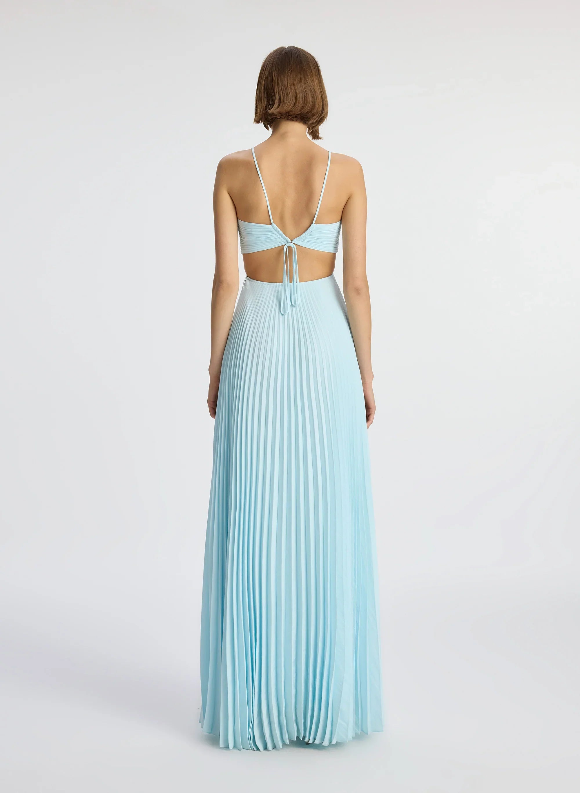 The Moira Dress is beautifully pleated and draped from our signature matte fabric in an aqua-blue hue. This full-length gown features delicate multi-wear straps and an empire waist with cutouts that wrap around to reveal an open crisscross tie-back. This style runs true to size. Shop Dresses