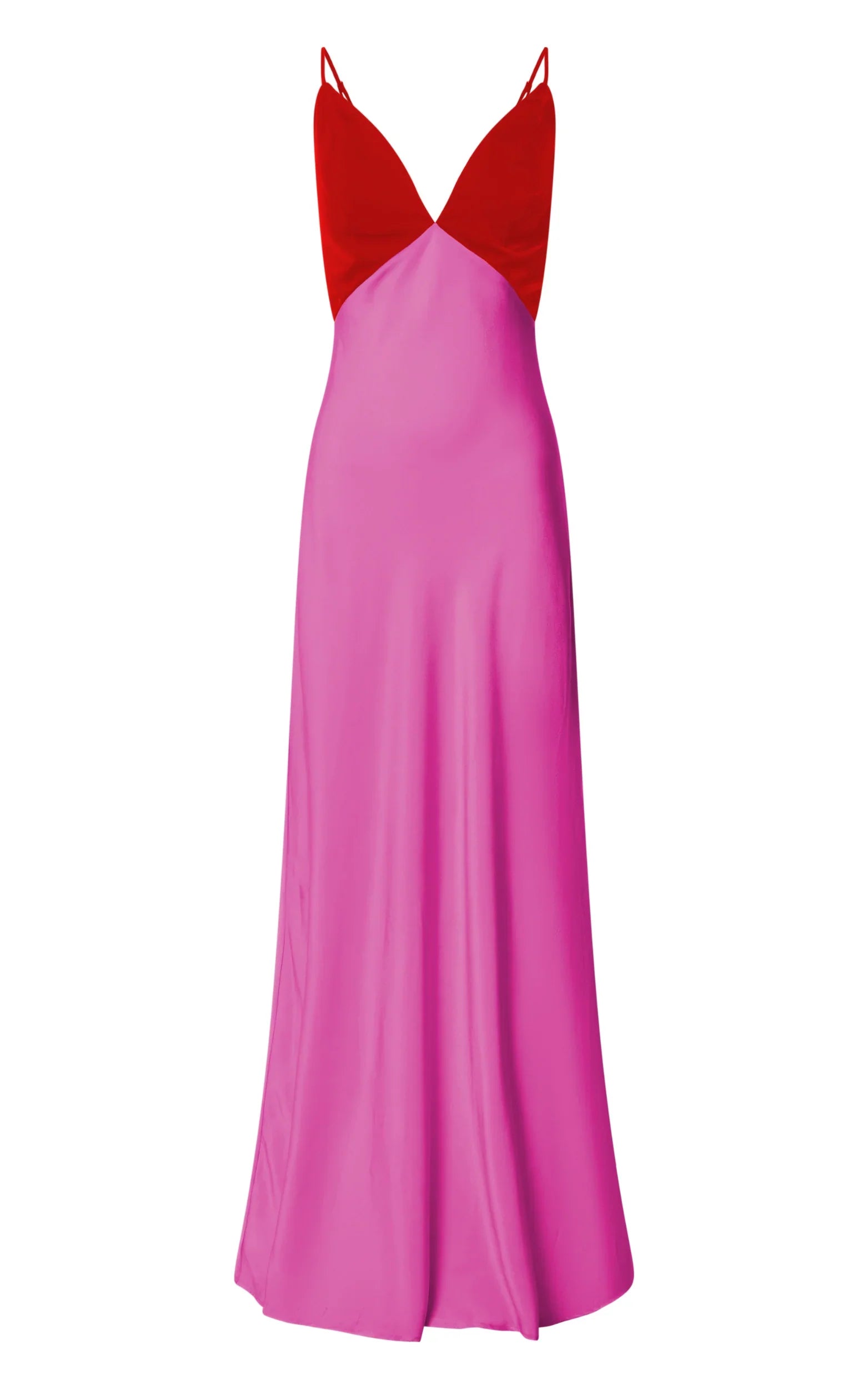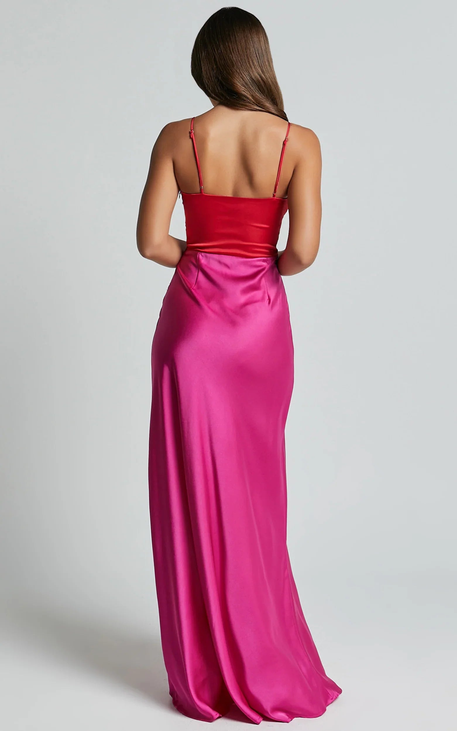 Make a bold statement in the Quincy Maxi Dress - Contrast Panel Satin Slip Dress in Red/Pink. This stunning formal dress features a plunging neckline and sleeveless design, perfect for showing off your confidence and embracing your feminine power. The luxurious satin fabric drapes effortlessly over your curves, while the contrast panel adds a touch of modern elegance. Whether you're attending a special event or simply want to feel glamorous, this maxi dress is sure to turn heads. Made from high-quality polyester, it's not only stylish but also comfortable to wear all night long. Stand out from the crowd and exude confidence in this show-stopping red satin gown.