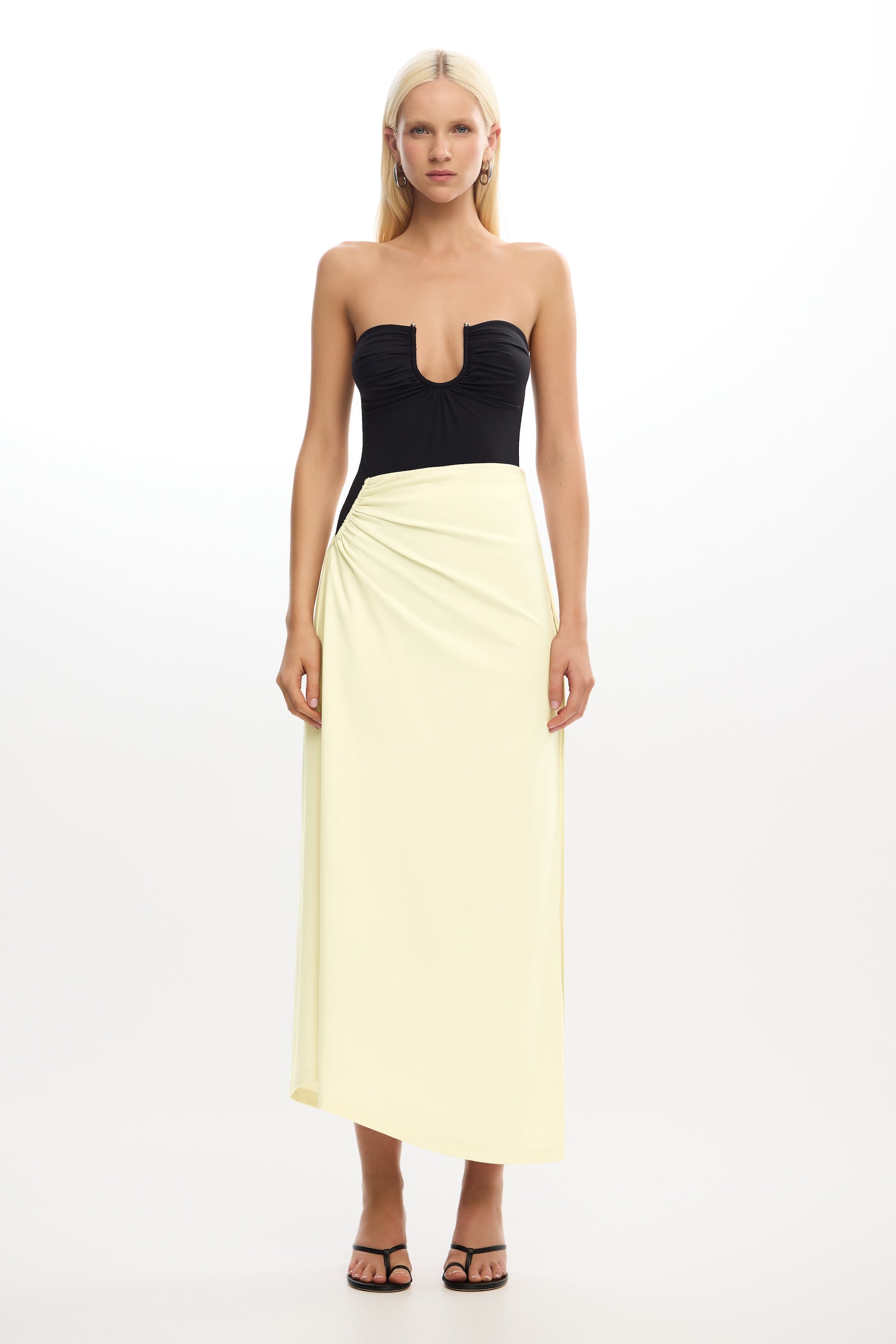A sleek addition to your wardrobe, the Shelby Maxi Skirt in Vista Yellow is both modern and versatile. The soft stretch fabric drapes effortlessly, while the asymmetrical hemline and sculptural U-shaped wire detail add a contemporary edge. Pair it with a fitted top for a night out or tailored pants for a more an elevated, everyday look.